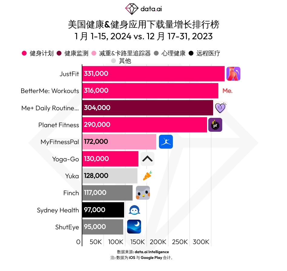 与 2023 年最终的半个月比较,重视健康和健身的美国用户最喜爱的运用有哪些改变?咱们列出了它们的排名。它们依照与前两周比较添加的下载量进行排序。